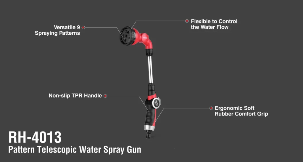 سری آب‌پاش تلسکوپی رونیکس مدل RH-4013، دارای 9 حالت مختلف پاشش آب بوده و با سایز استاندارد خود، برای اتصال به تمام شلنگ‌های باغبانی مناسب است. این محصول طراحی منحصربه‌فردی دارد و بسیار دقیق آب‌بندی شده است که موجب صرفه‌جویی در مصرف آب و عملکرد ضد نشتی آن می‌‌شود.